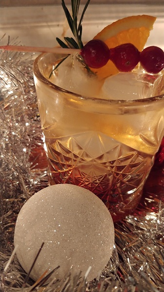 Dans un verre de type Old Fashioned, verser le vermouth et le Grand Marnier. Remplir le verre de glace et allonger au vin mousseux. Décorer avec une branche de romarin, une demi tranche d’orange et 3 canneberges fraîches ou congelées sur un pic.